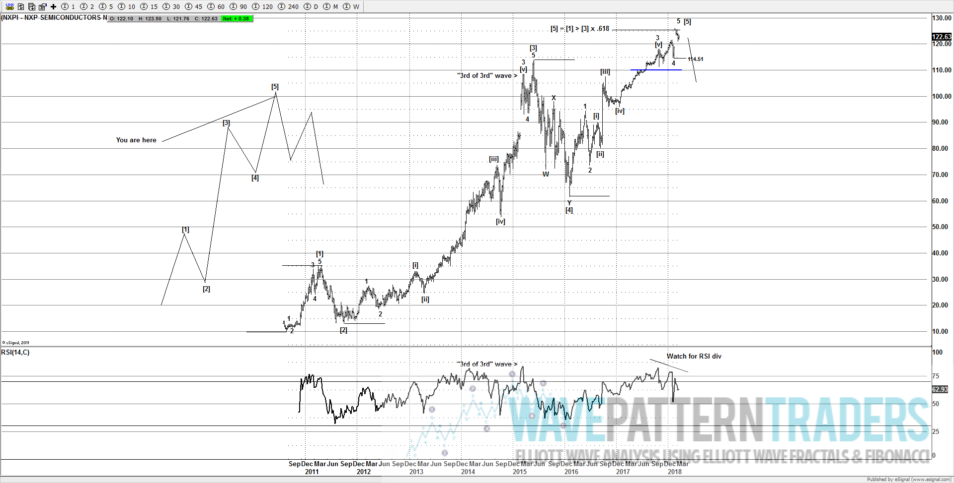 With the new high its now possible to label 5 waves from the 2016 lows, thats important as it can also end a much larger impulse wave (5 wave advance) from the 2010 lows. A strong move below 114.51, then 110.00 is needed to support further downside and suggest a top in place for wave 5 of wave [5]. If you own this stock you may wish to put protective stops at 114.51 to lock in any gains you have.